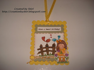 My second card the birthday banner is from Julie's set and I ran that through the printer and only colored in the letters, added brads on the end of the banner, colored her with copics only, spell binders foliage and ovals, stickles and glossy accent to her ribbon on her hair and did my own spiral roses added pearls and papers from Making Memories.